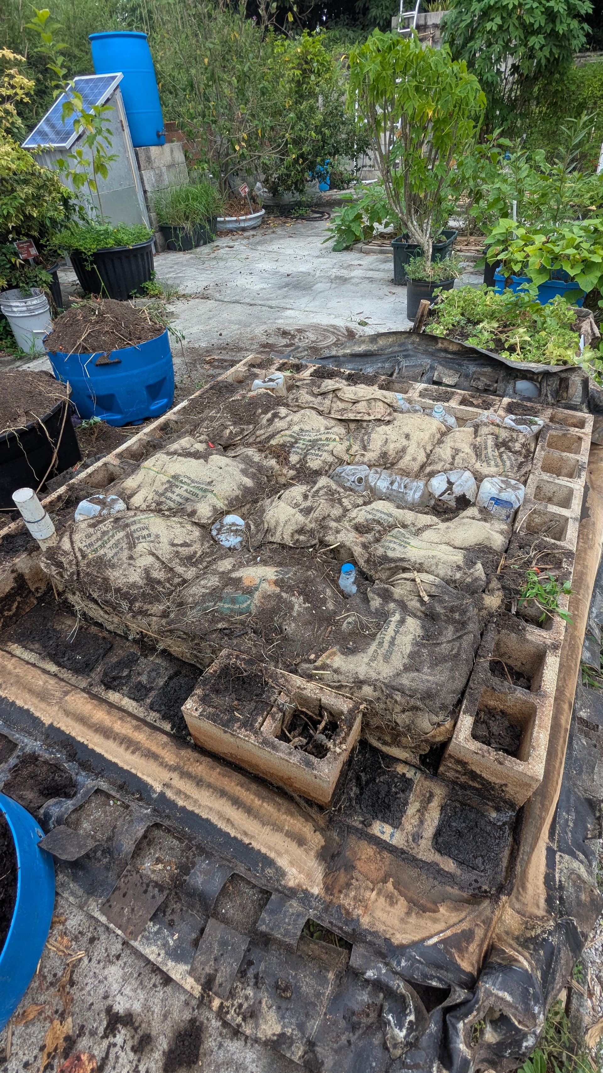 The new bed is filled with a mix of coconuts, rocks, bricks, pieces of cinderblock, and shell. The holes of the cinderblock are filled mainly with glass bottles and the south half has t-shirts along with the glass bottles to test if it will help with wicking. My guess is that if the coconuts break down the bed may need to be rebuilt within a year. I would like to see how these materials hold up compared to the trash and recyclables previously used.