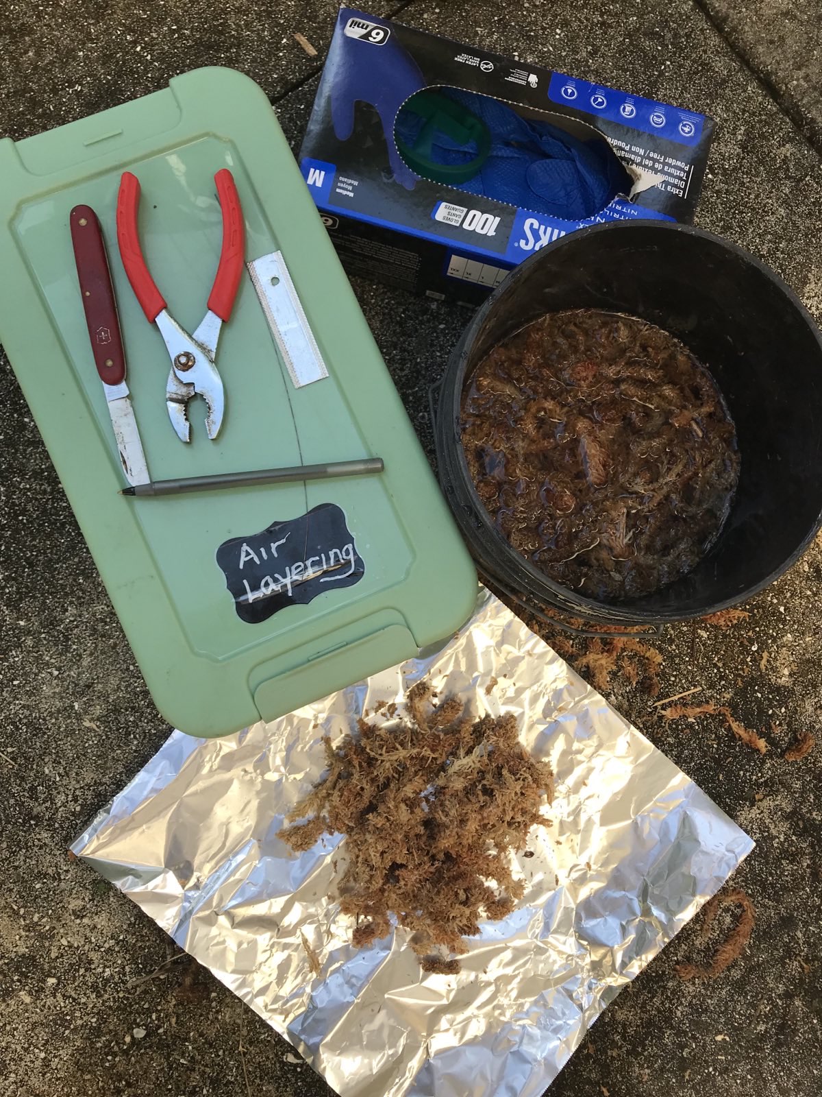 These are the supplies we use for airlayering: a knife, plyers, sphagnum moss, bucket, water, heavy duty tin foil, pen, metal tag, gloves.
