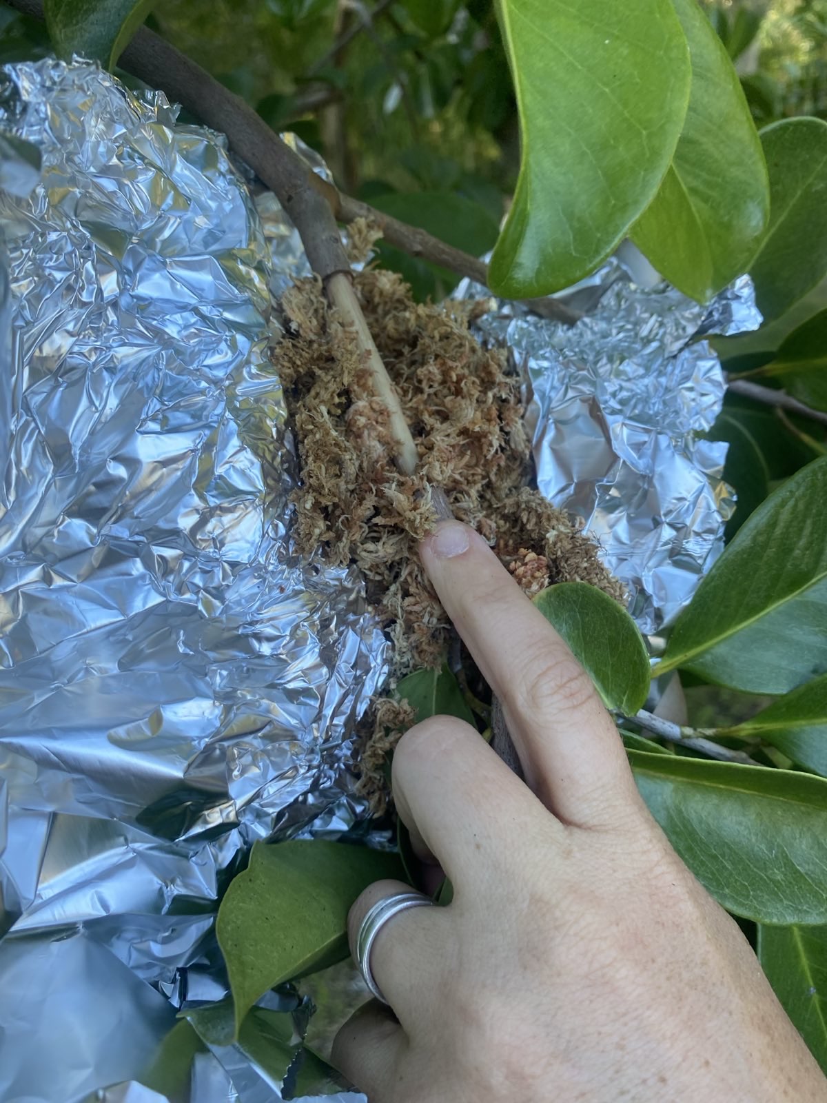 We prepare our sphagnum moss by soaking it in water to rehydrate it and then squeezing out almost all the moisture. This handful/1cup of sphagnum is then placed in a square of heavy duty tin foil. We wrap this around the cut stem, making sure the cut towards the tip of the stem is particularly covered with sphagnum.