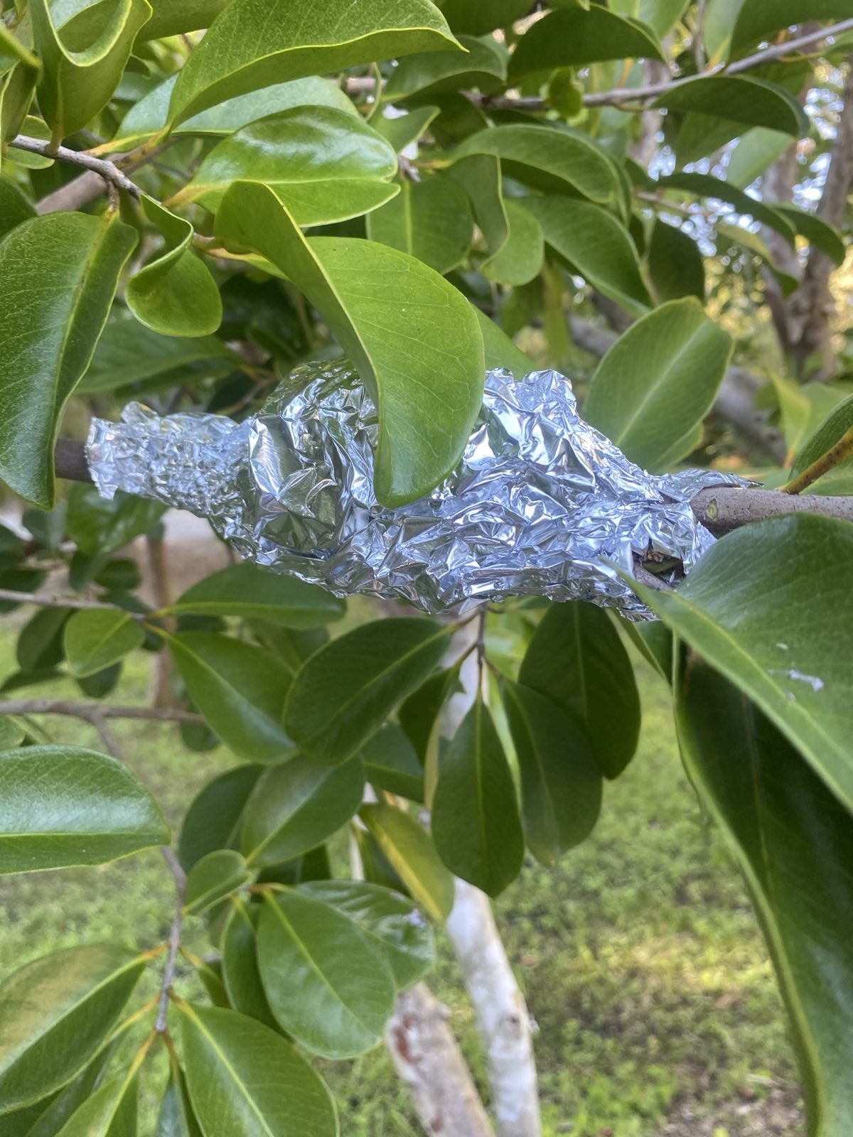 A simple twist on each end in opposite directions is enough to hold our airlayer on the branch for several months. We add a metal tag to the tip end of the airlayer so that we know what variety we have when we harvest them in bulk at the end of the airlyering season.