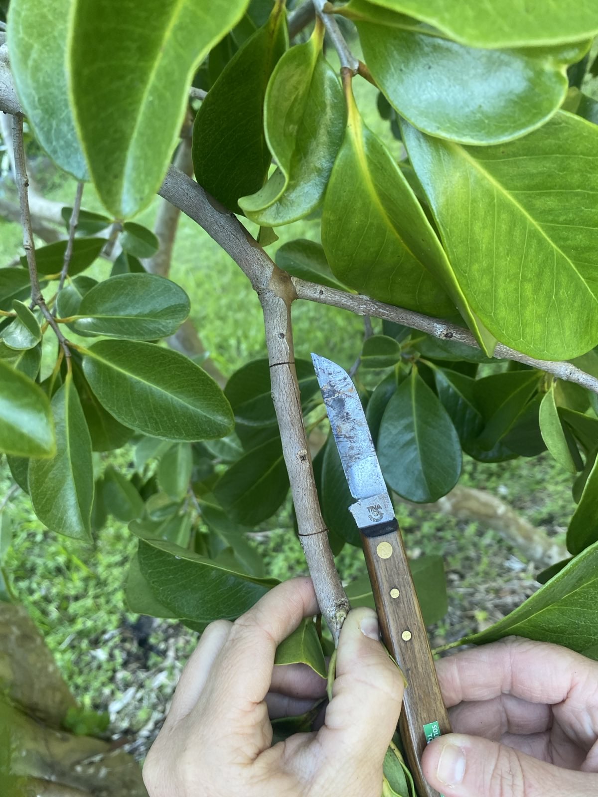 We look for a branch that is between 0.5in (1.27cm) to 1.25in (3.17cm) thick. Imagine what the branch will look like once you cut it off and pot it up. Avoid branch crotches right above your cut and look for single stems. Keep the branch beyond your cut between 1-2 ft (30-60cm) so that the root-to-shoot ratio will not be off when you harvest the airlayer later.