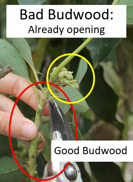 When the buds are too far pushed we avoid them for grafting. However you can cut off terminal buds that are too far pushed (yellow circle below) and use the remaining side buds that are not as far along (red circle below).