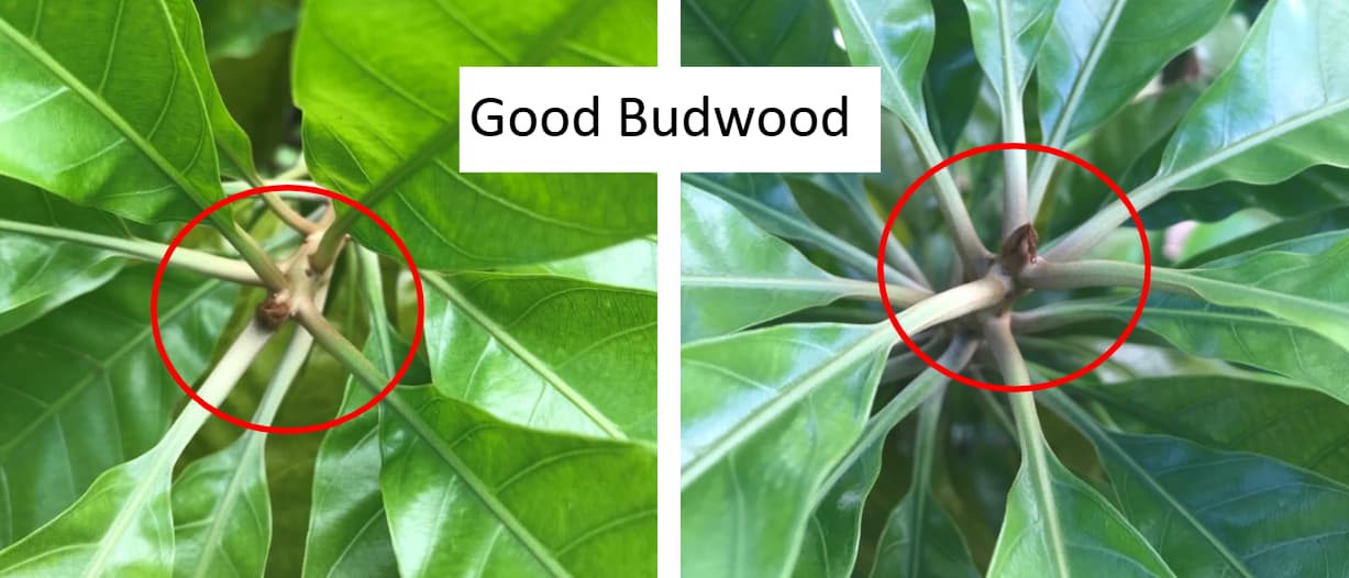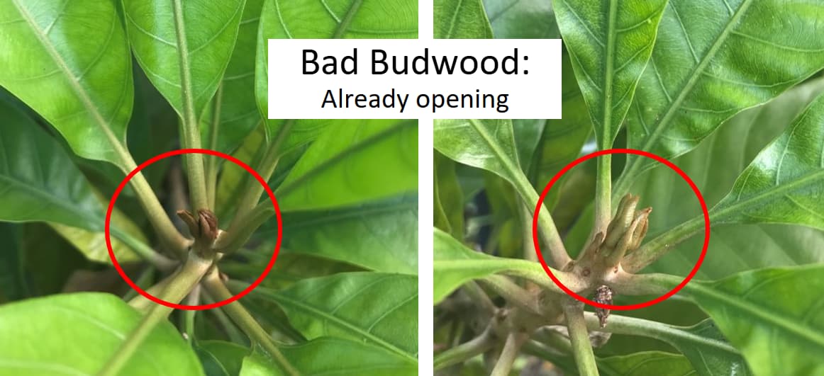 Good Budwood - All the leaves surrounding the bud are hardened off. The bud is full, but none of the “fingers” (future new leaves) have started to open. The bud is full and plump.