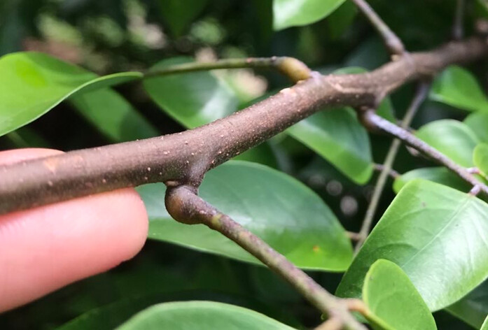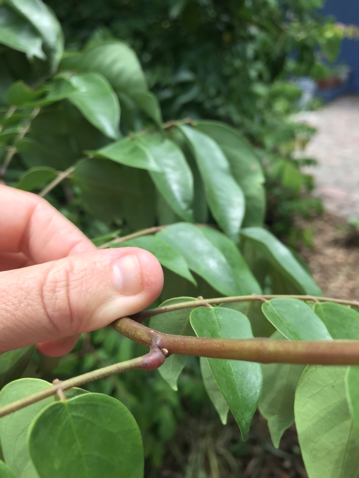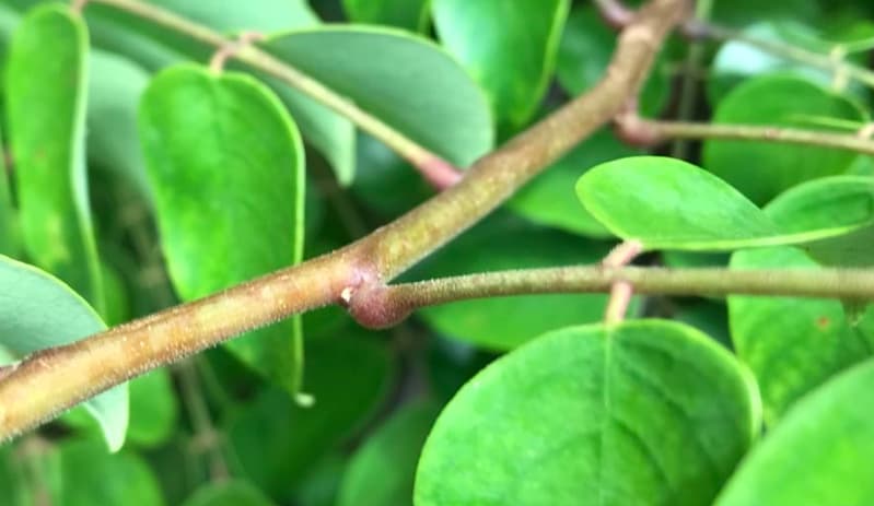 Ideal budwood looks like little rolled oats tucked at the leaf petioles along a hardened off branch.