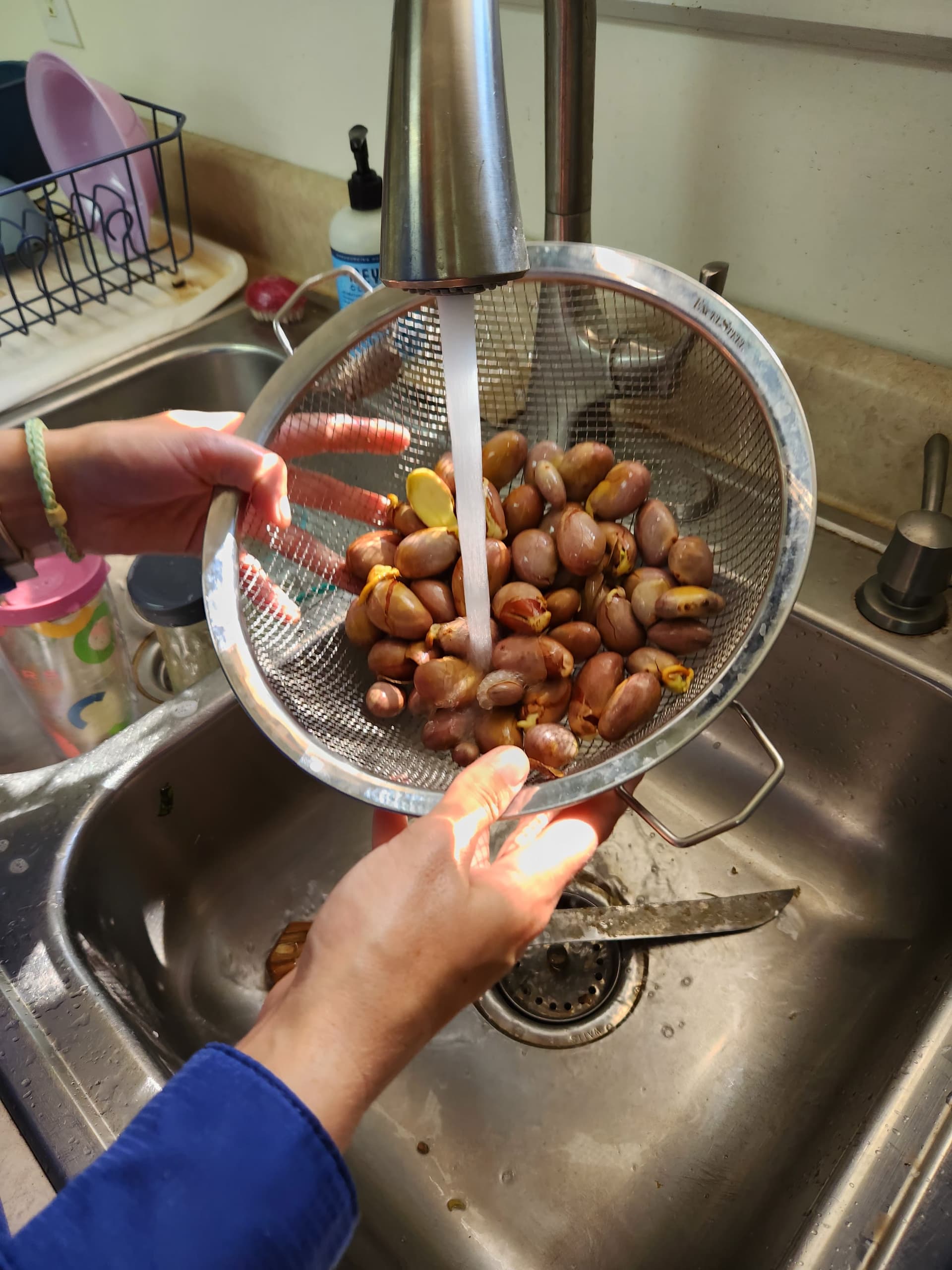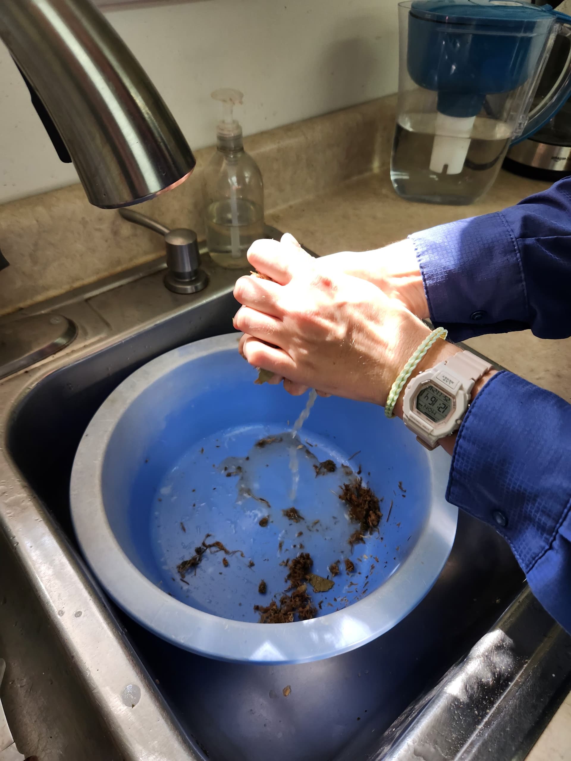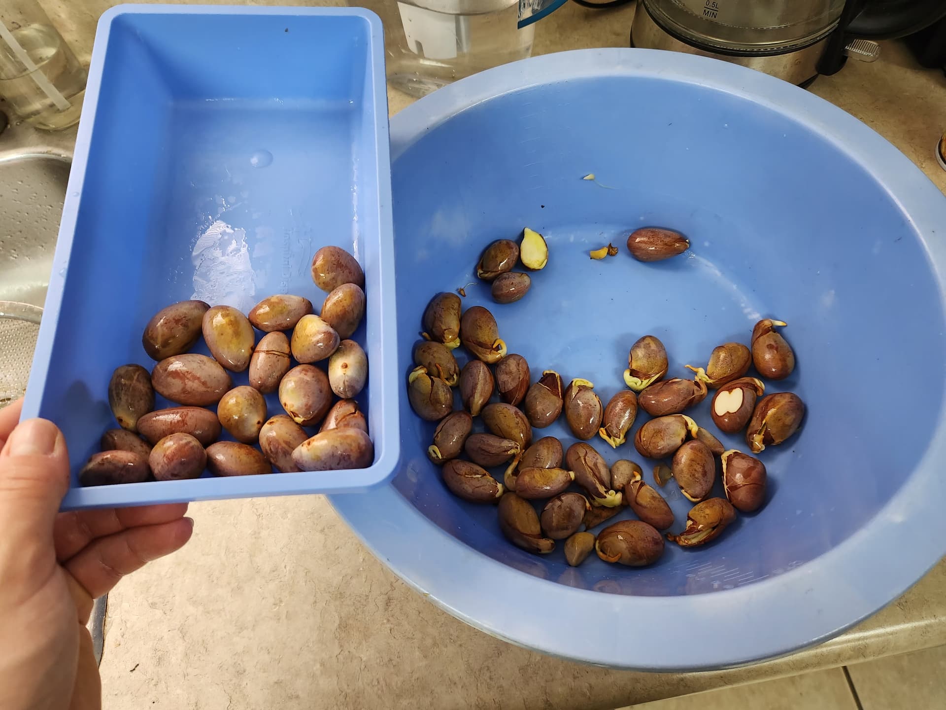 Next, rinse the seeds to remove the sugary fruit juices, and separate the sprouted seeds from unsprouted ones. We’ll store the unsprouted seeds; the sprouted seeds can be planted right away but not stored.