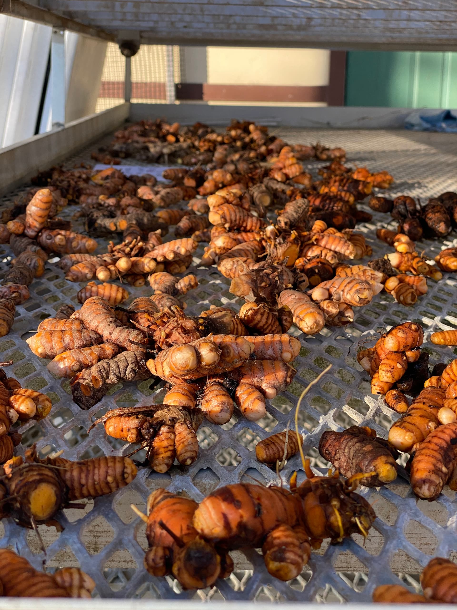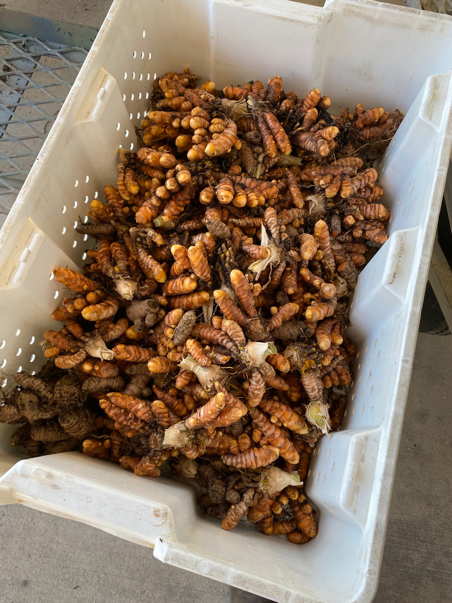 We left the Turmeric out to dry for a couple of days so that they go dormant before harvesting. It is helpful to let the plants dry out before harvesting the Rhizome.