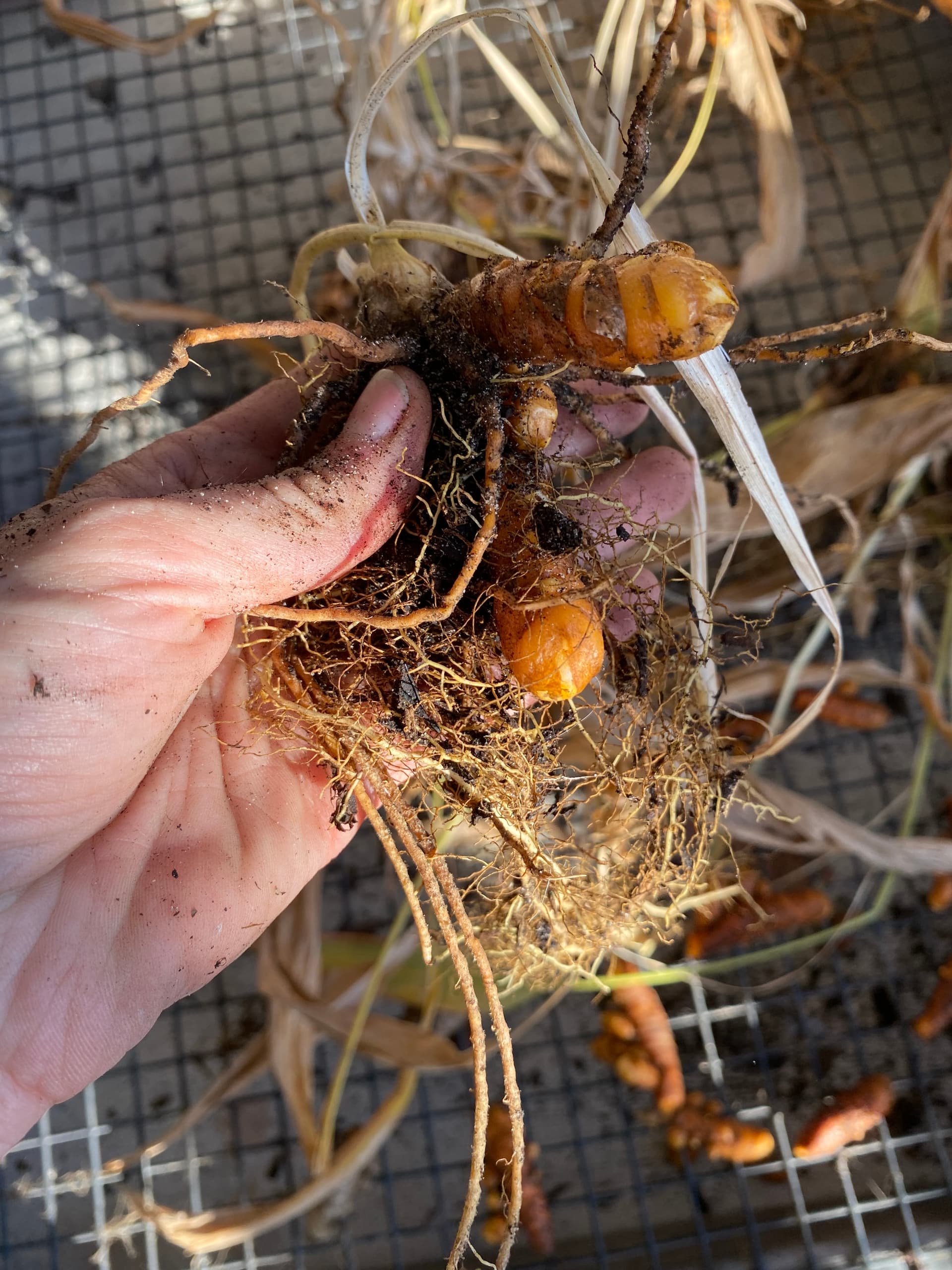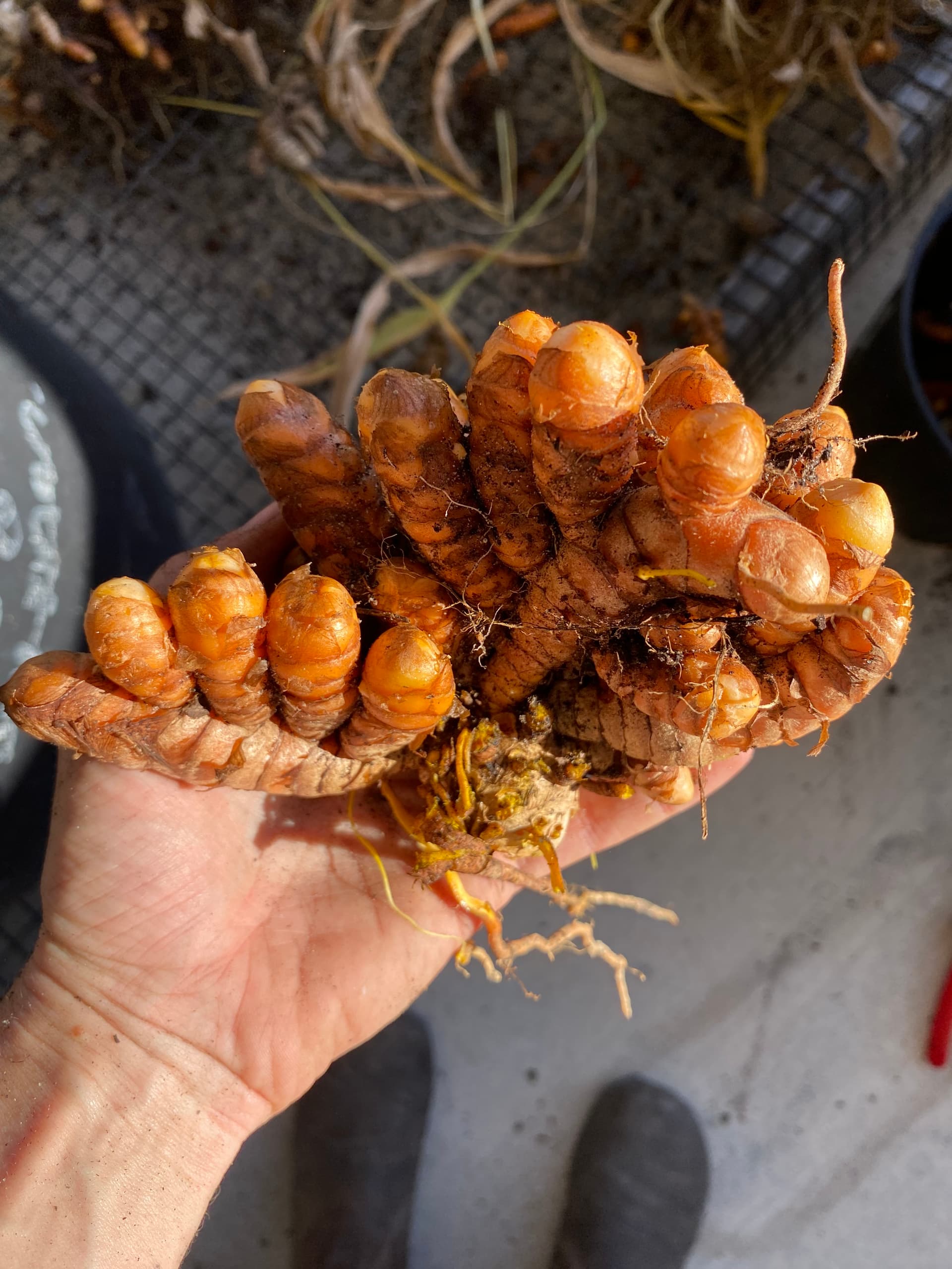 Harvesting Turmeric is, in my mind, one of the post satisfying plants to harvest. You get to stick your hands deep in the soil and pull out uniquely formed and deeply colored orange treasures. It is rewarding and thrilling to find a huge clump held tightly together.