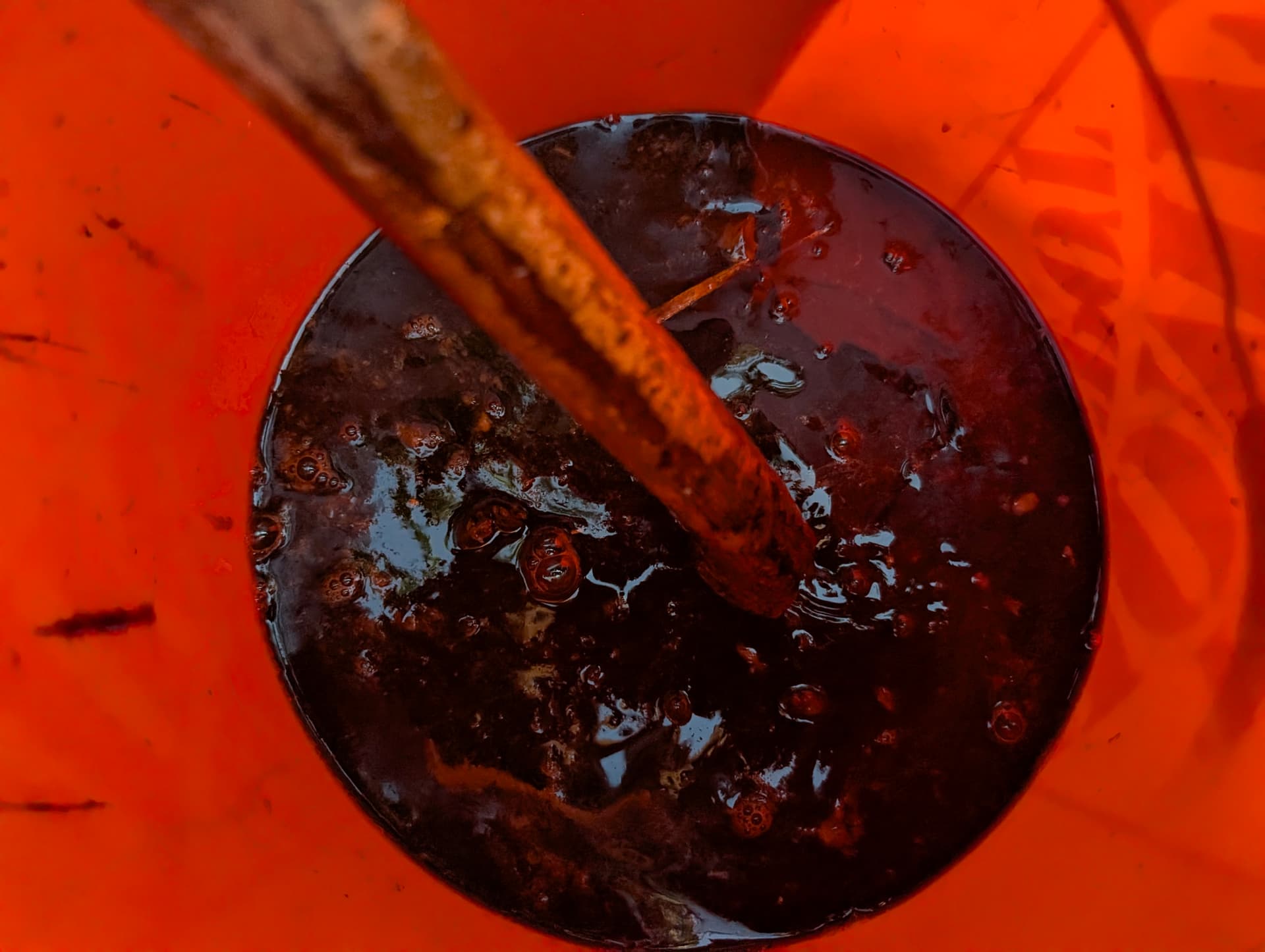 After chopping the fish, add the molasses (1 L) and water (3 L) and stir the mixture very well. Some sources even say to stir as long as an hour. However long you choose to stir, make sure it’s all mixed up as much as possible!