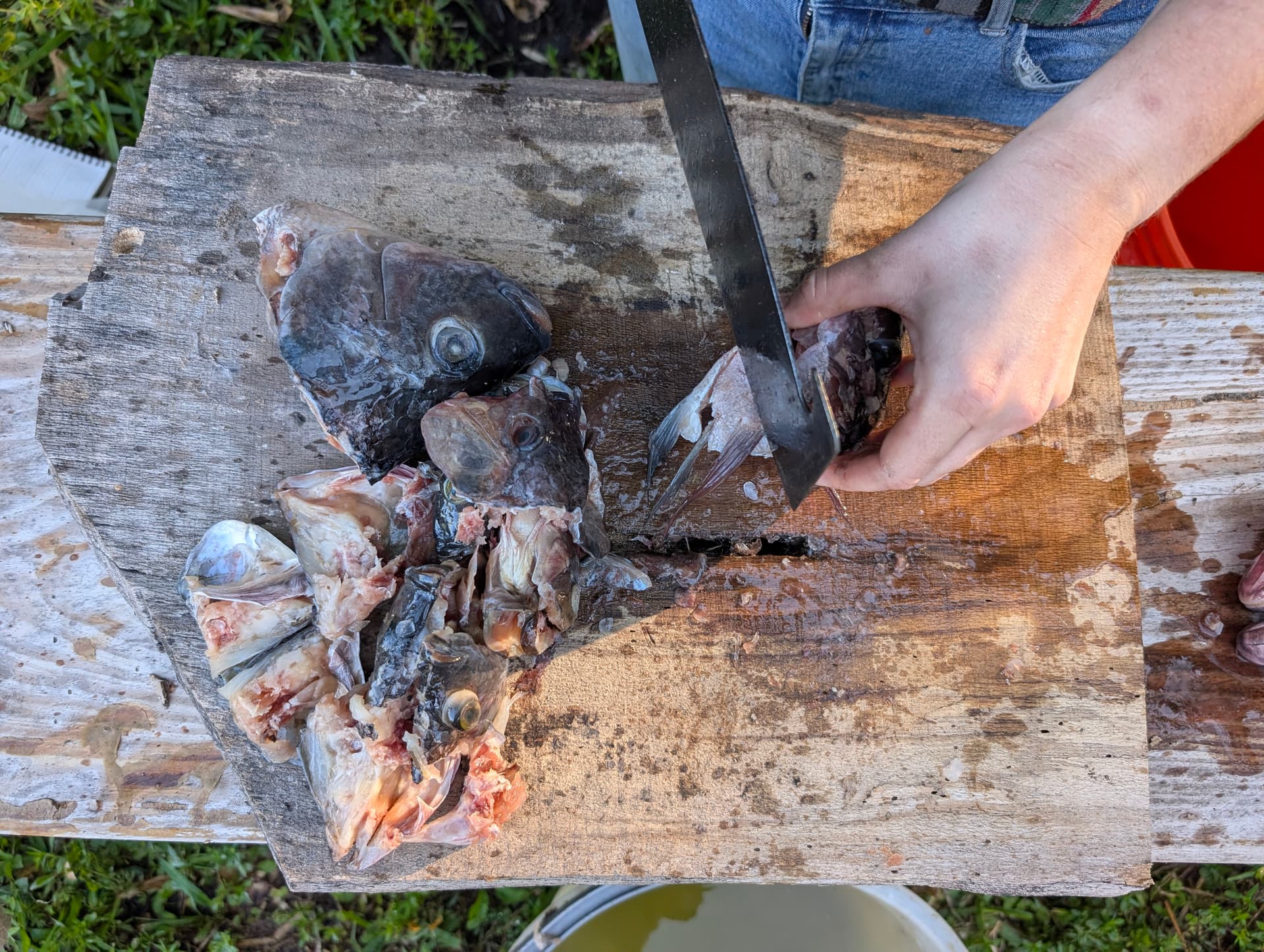 Next, simply chop the fish parts into small pieces (the more surface area the better as it allows more comprehensive microbial breakdown).