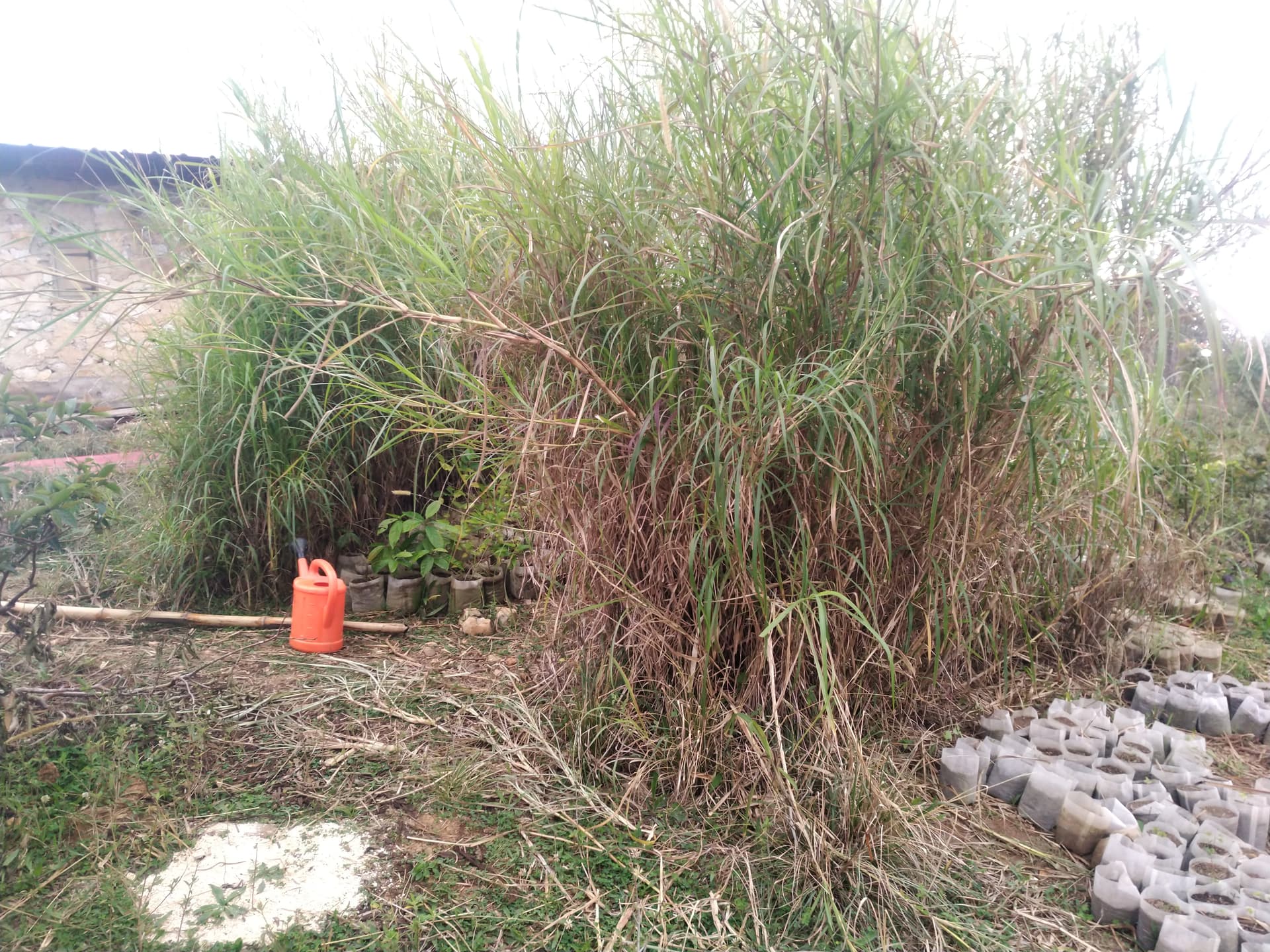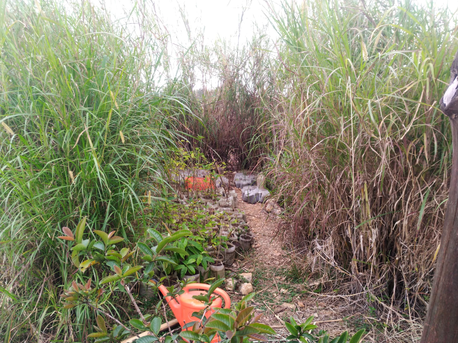 We stumbled across a simple way to make a plant nursery at our farm in the mountains of Haiti. This may be so obvious that lots of people have done this already but I haven’t seen it described elsewhere so thought I would share it. We had a small gravel pad that was used for a temporary, sheet-metal/bamboo house here that we no longer needed so the house was removed. The pad had been surrounded by Napier grass on three sides. As the Napier got tall, it created a somewhat shaded area in the middle and so I decided to set up my plant nursery in there to allow the plants to get some light with getting too dried out by the sun. It has worked well so far. The only maintenance has been cutting back the Napier grass when it gets too tall and starts to fall over.