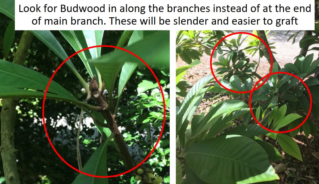 We have found that where the buds are sourced on the tree will facilitate better grafts. We are usually trying to time it right to cleft graft young slender budwood onto young slender rootstock. With this timing we have fairly high success rates.