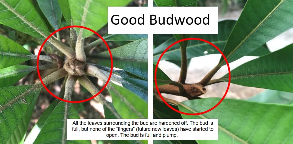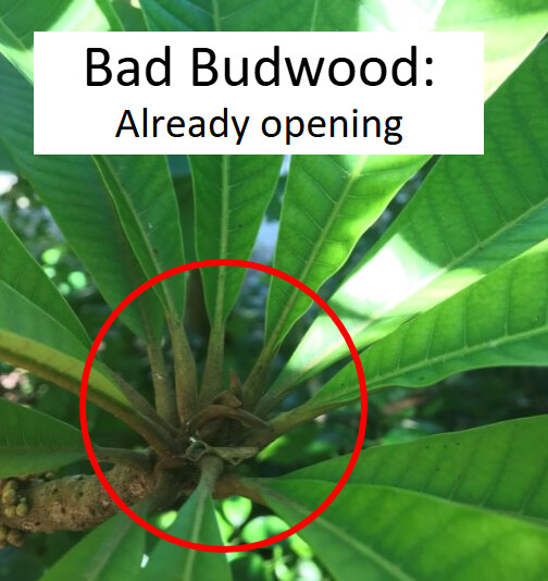 Good Budwood - All the leaves surrounding the bud are hardened off. The bud is full and plump, but none of the “fingers” (future new leaves) have started to open.