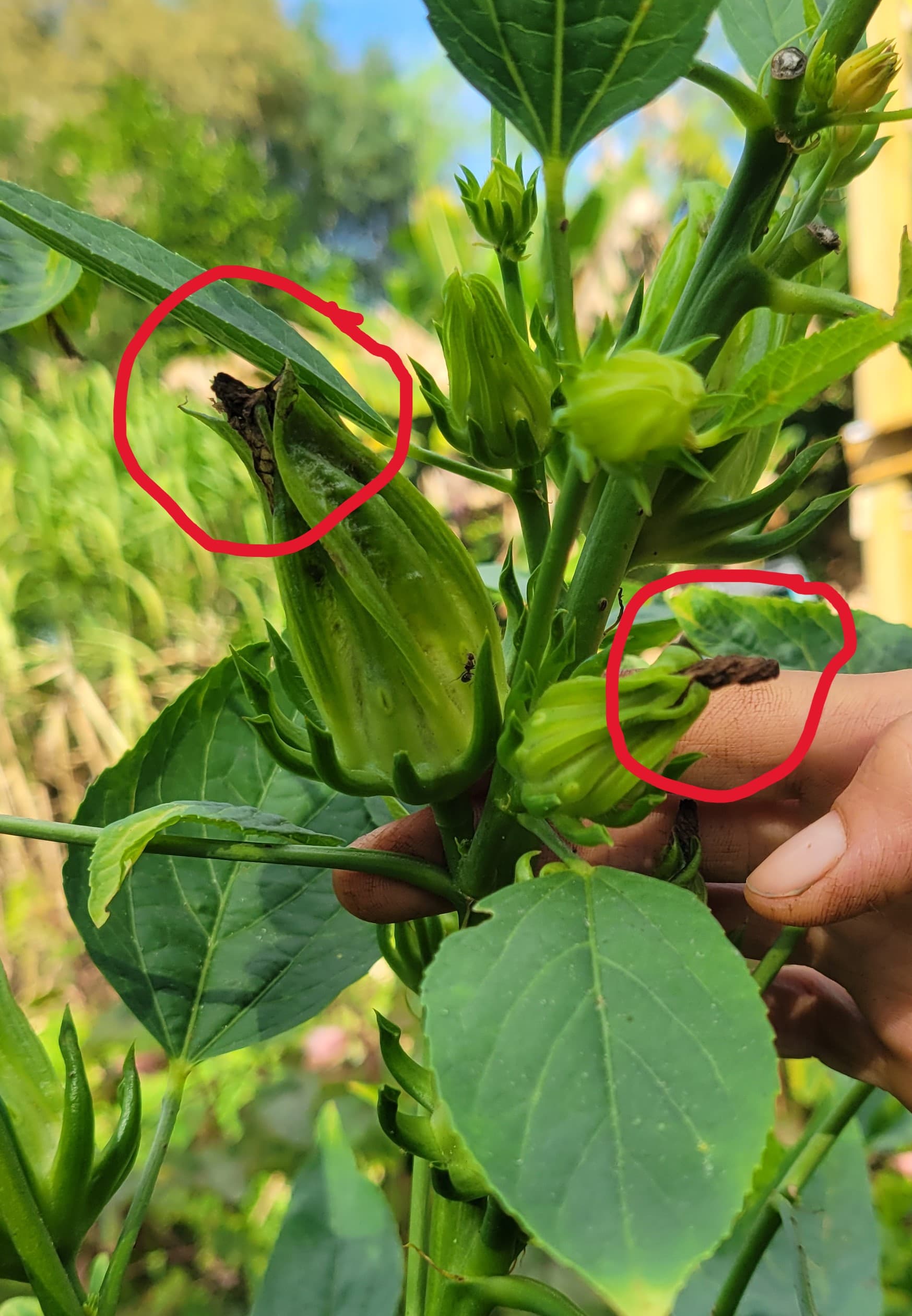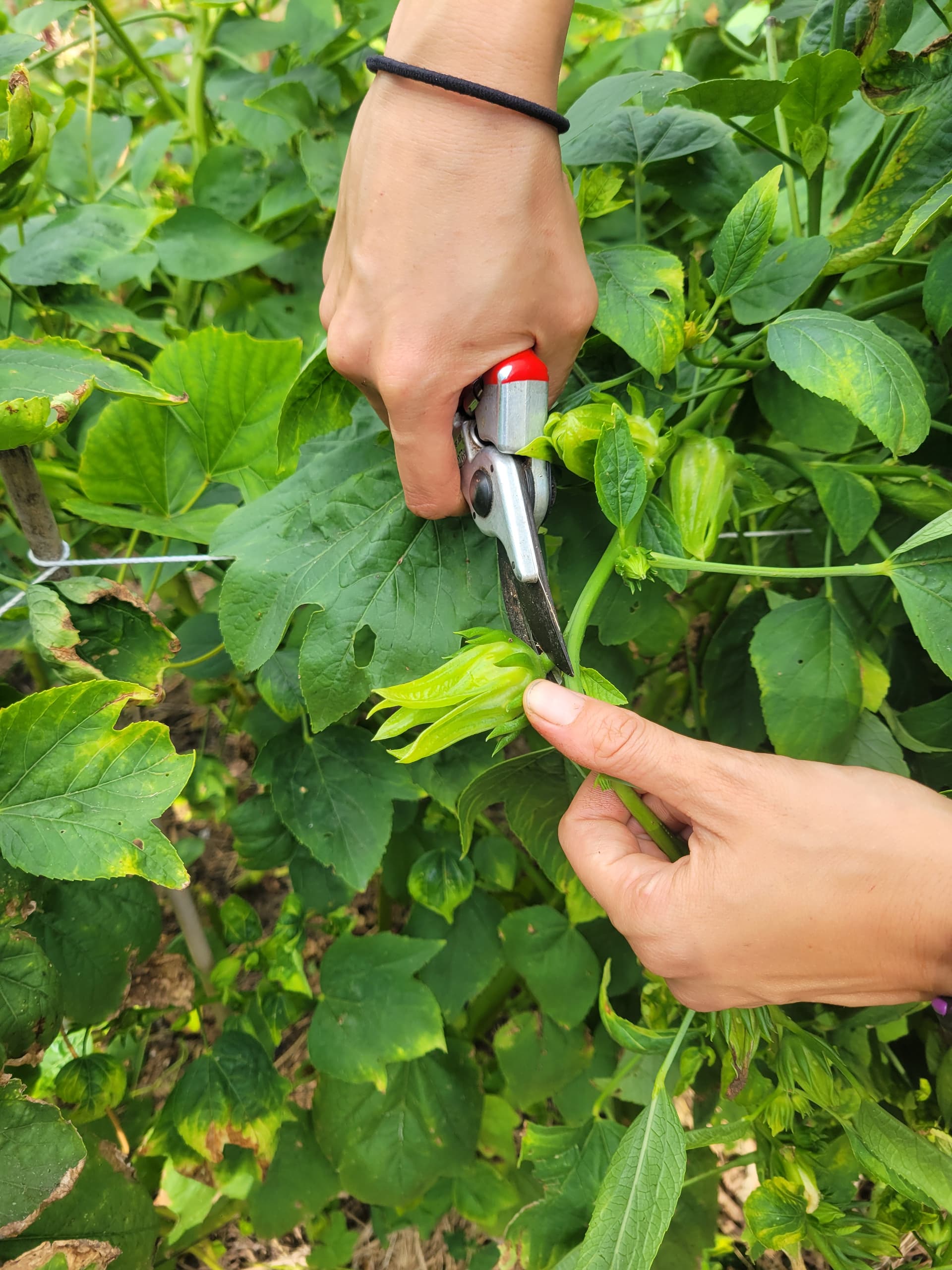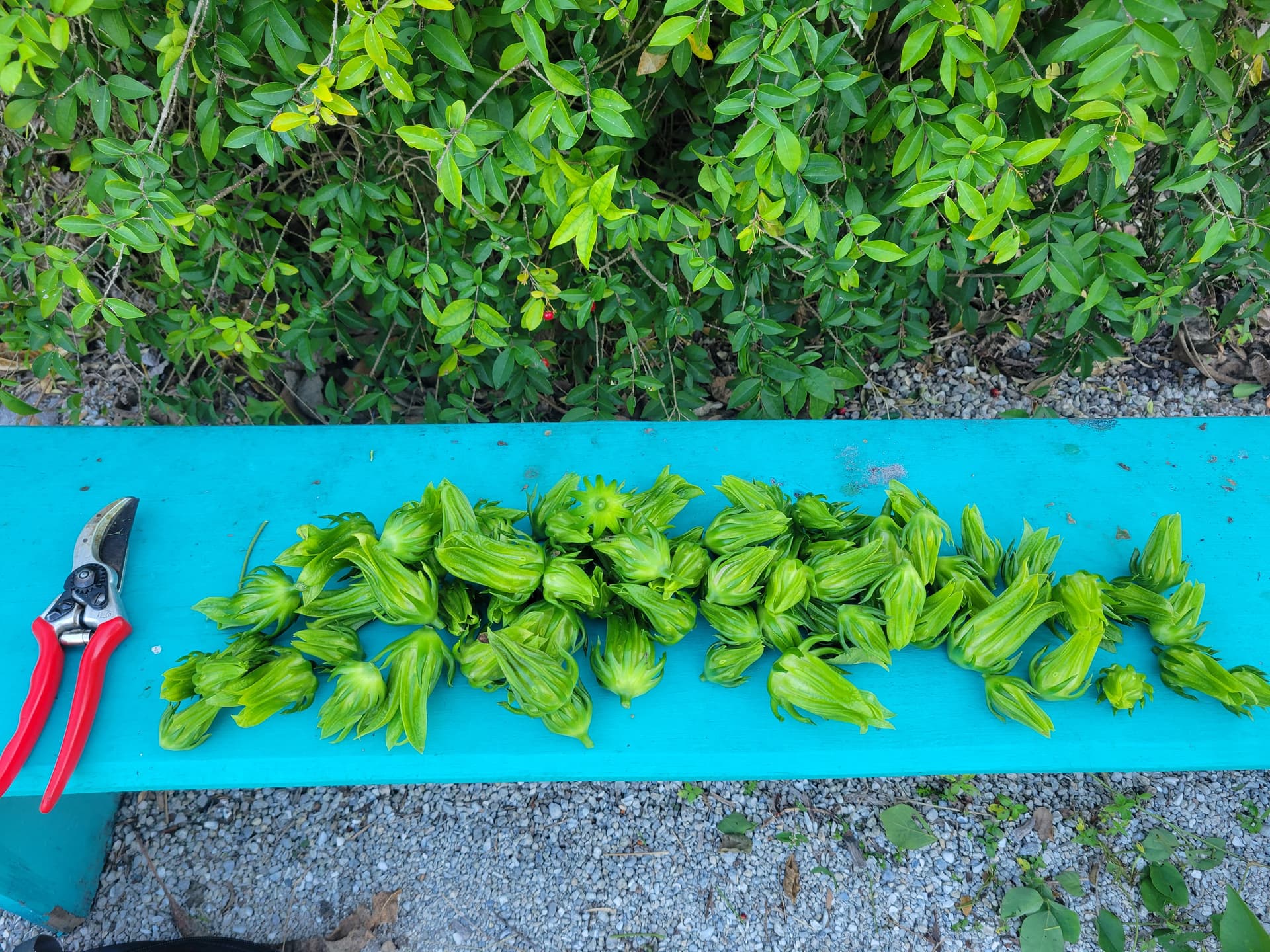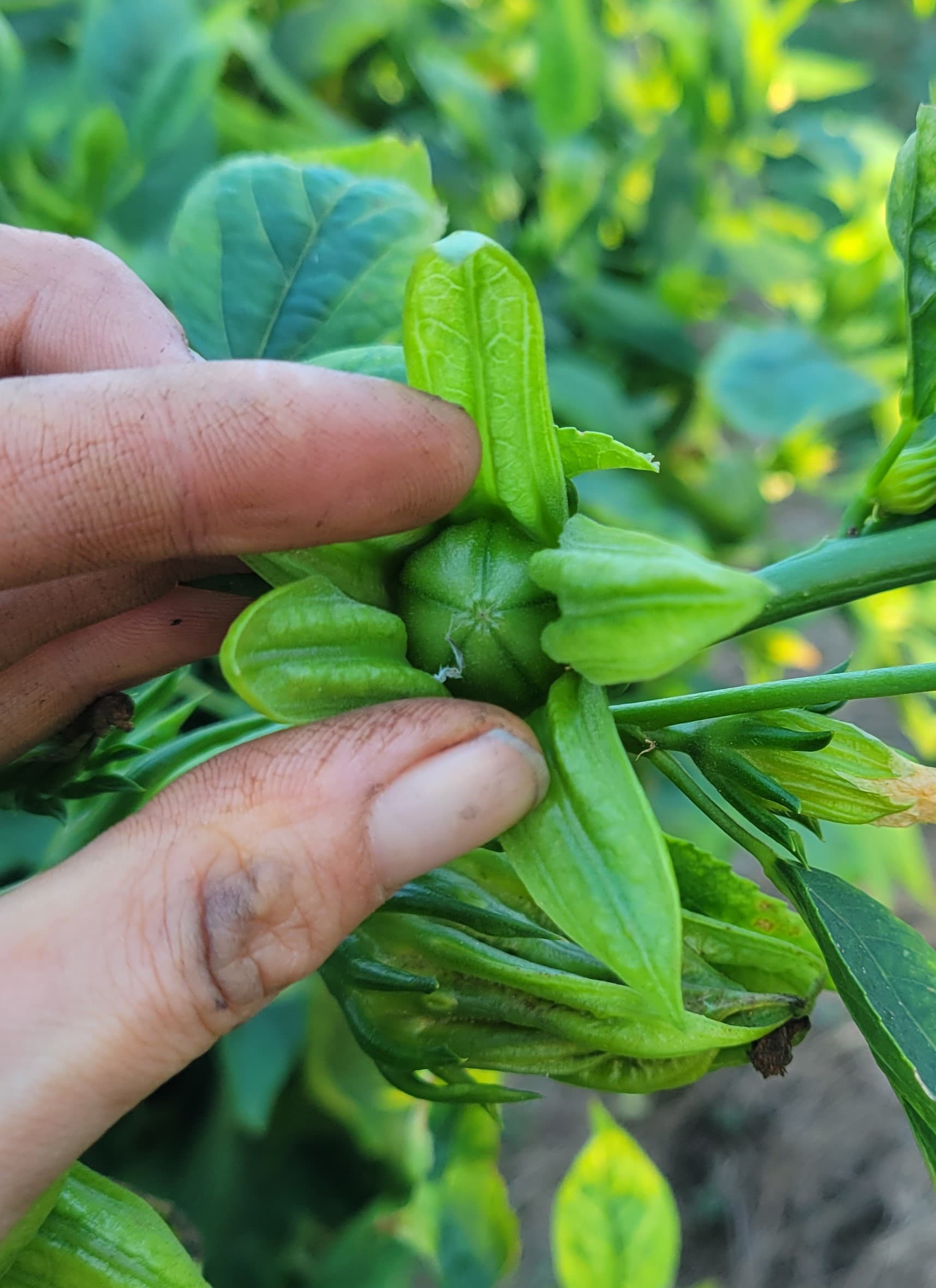 When harvesting the calyxes you want them to be large and full but not woody. Often, an ideal time to harvest is 2-3 days after the blossom falls off (See picture below), or 2-3 weeks after flowering.