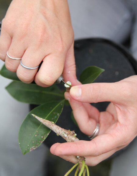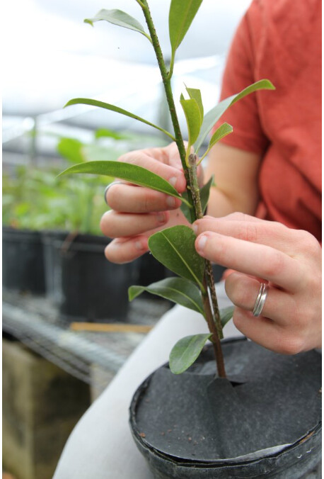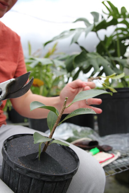 When we make the first cut to remove the top of the rootstock we make sure to leave at least 4 healthy leaves below where the graft union will be positioned. We have found this to be critical. It keeps the young rootstock alive during an often slow healing process for sapodilla.