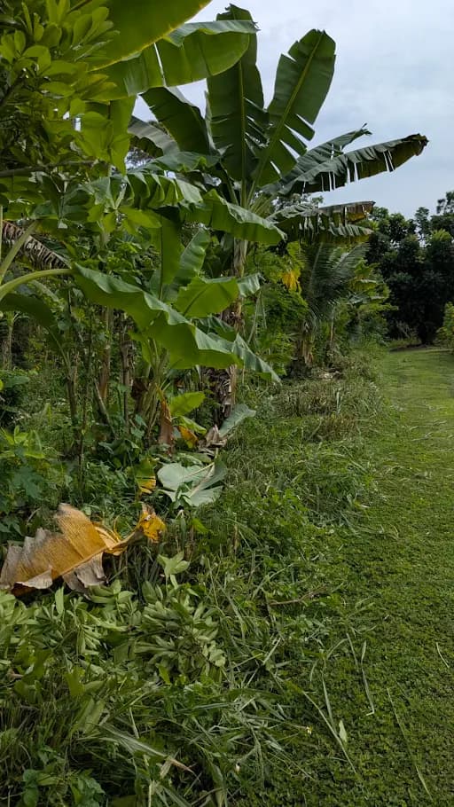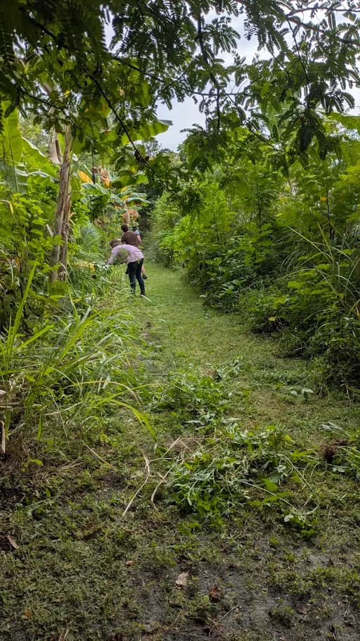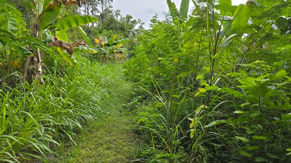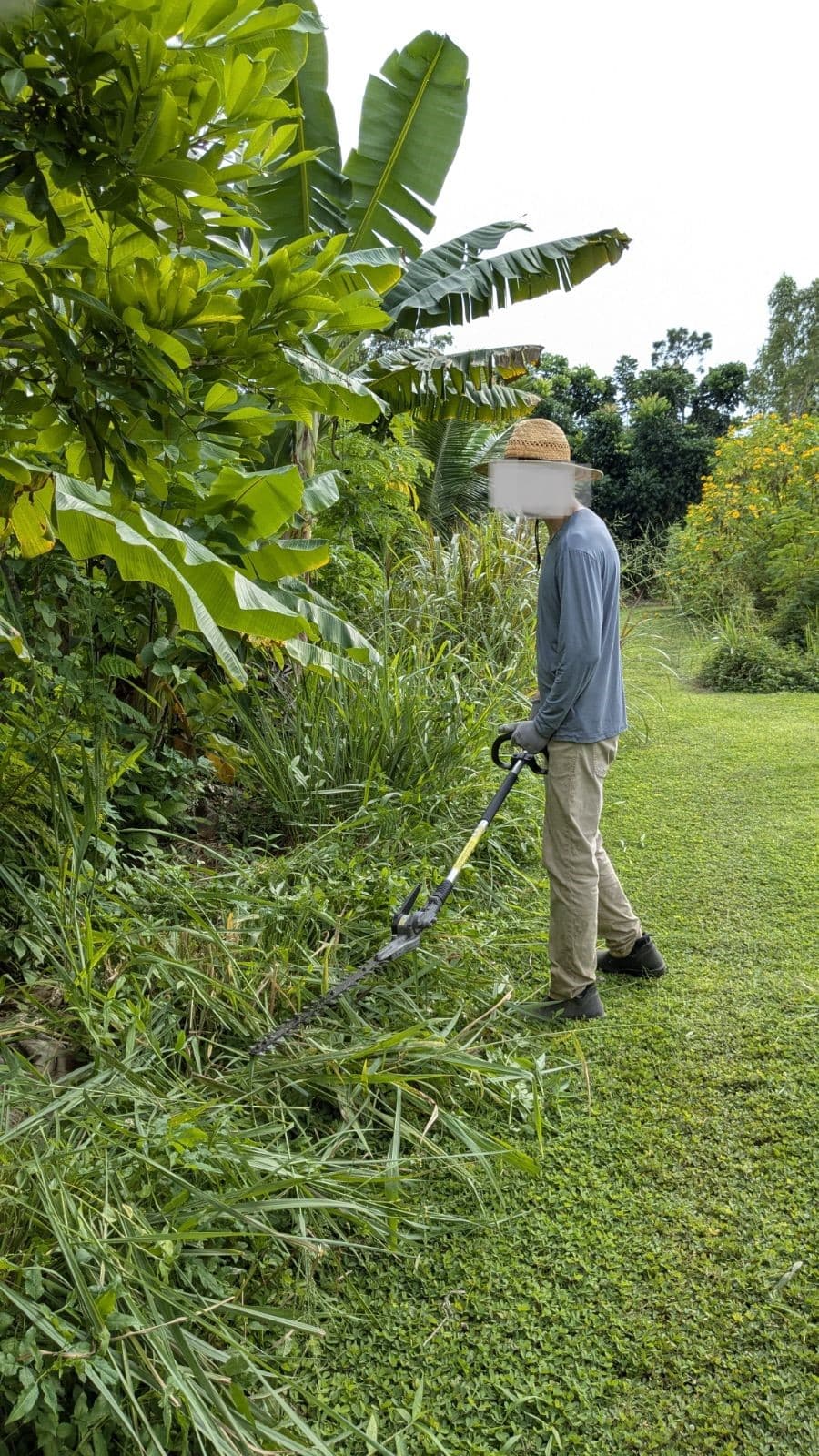 Maintenance: The side rows of biomass plants are chopped/dropped with a machete into the system to build the soil and feed the ‘target’ perennials that we want to grow for production. Our ‘biomass’ trees are also delimbed with a saw/pruners and the material is chopped and incorporated into the system.