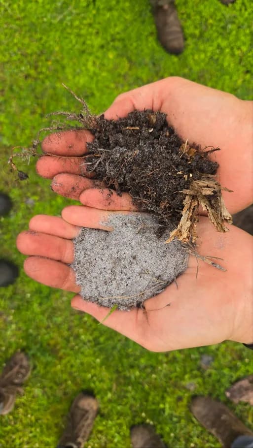 A photo of our native soil and our syntropic soil- after a few years of compost, degrading mulch material, and chopped vegetation on our system, the soil is very rich.